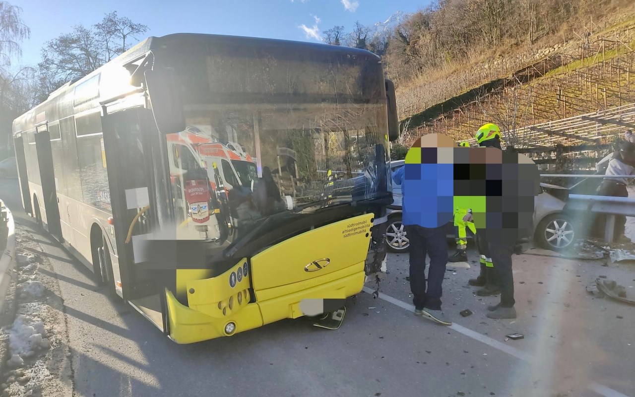 Scontro tra un auto ed un autobus di linea lungo la strada che da Lagundo porta verso la val Venosta. L’incidente è avvenuto lungo una curva, la peggio è toccata al conducente della vettura, che è rimasto intrappolato tra le lamiere. Ferite lieve per l’autista del bus. [fm] (Foto: vigili del fuoco)
