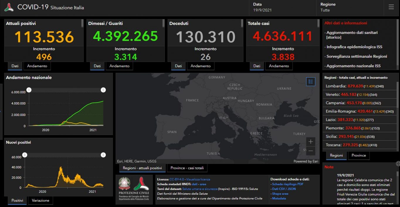 COVID, 3.838 NUOVI CASI E 26 DECESSI NELLE ULTIME 24 ORE