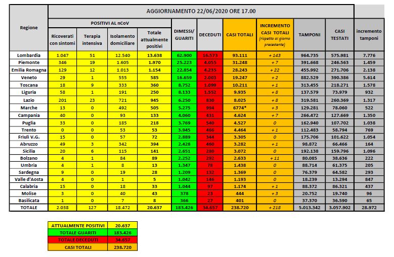 ROMA (ITALPRESS) – Al 22 giugno il totale delle persone che hanno contratto il coronavirus che causa il Covid-19 è di 238.720, con un incremento rispetto a ieri di 218 nuovi casi. Lo rende noto la Protezione Civile. Il numero totale di attualmente positivi è di 20.637, con una decrescita di 335 assistiti rispetto al … Continua a leggere