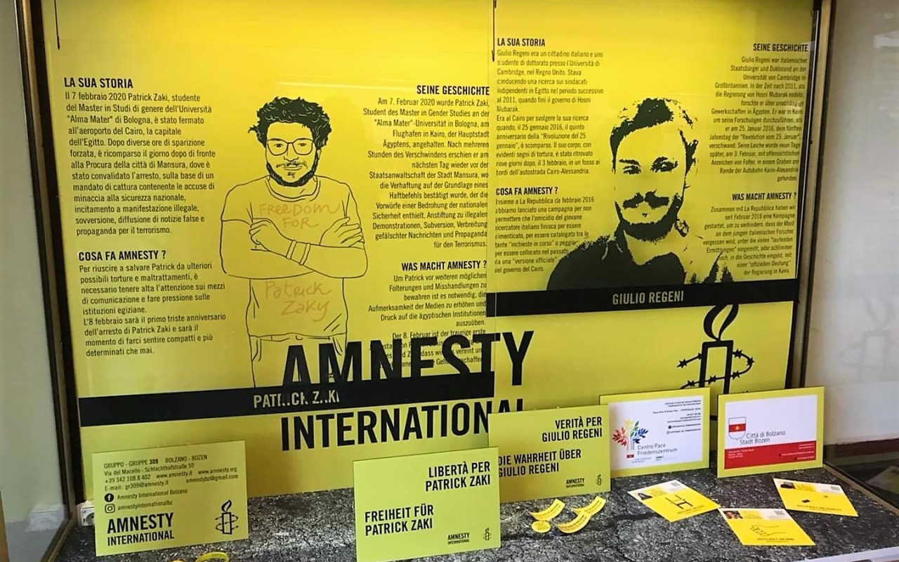 E’ stata inaugurata a Bolzano una vetrina in Passaggio Walther per ricordare Giulio Regeni e Patrick Zaki. La Città di Bolzano, insieme al Centro per la Pace, si è unita alla richiesta pressante di verità e oggi 3 febbraio, nel quinto anniversario della scomparsa di Giulio Regeni, ha inaugurato una vetrina nel sottopassaggio che si … Continua a leggere