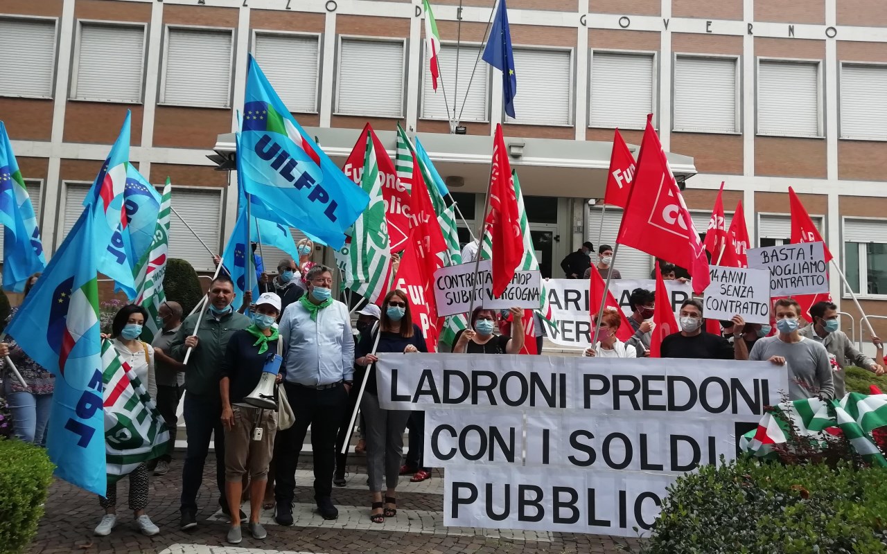 Manifestazione della Cgil davanti alla sede del Commissariato del Governo a Trento per chiedere il rinnovo del contratto della sanità privata. Dopo 3 anni di trattative e 14 anni di contratto fermo, si era giunti ad un accordo condiviso, ora, contesta il sindacato, nuovamente disdetto. [mda]
