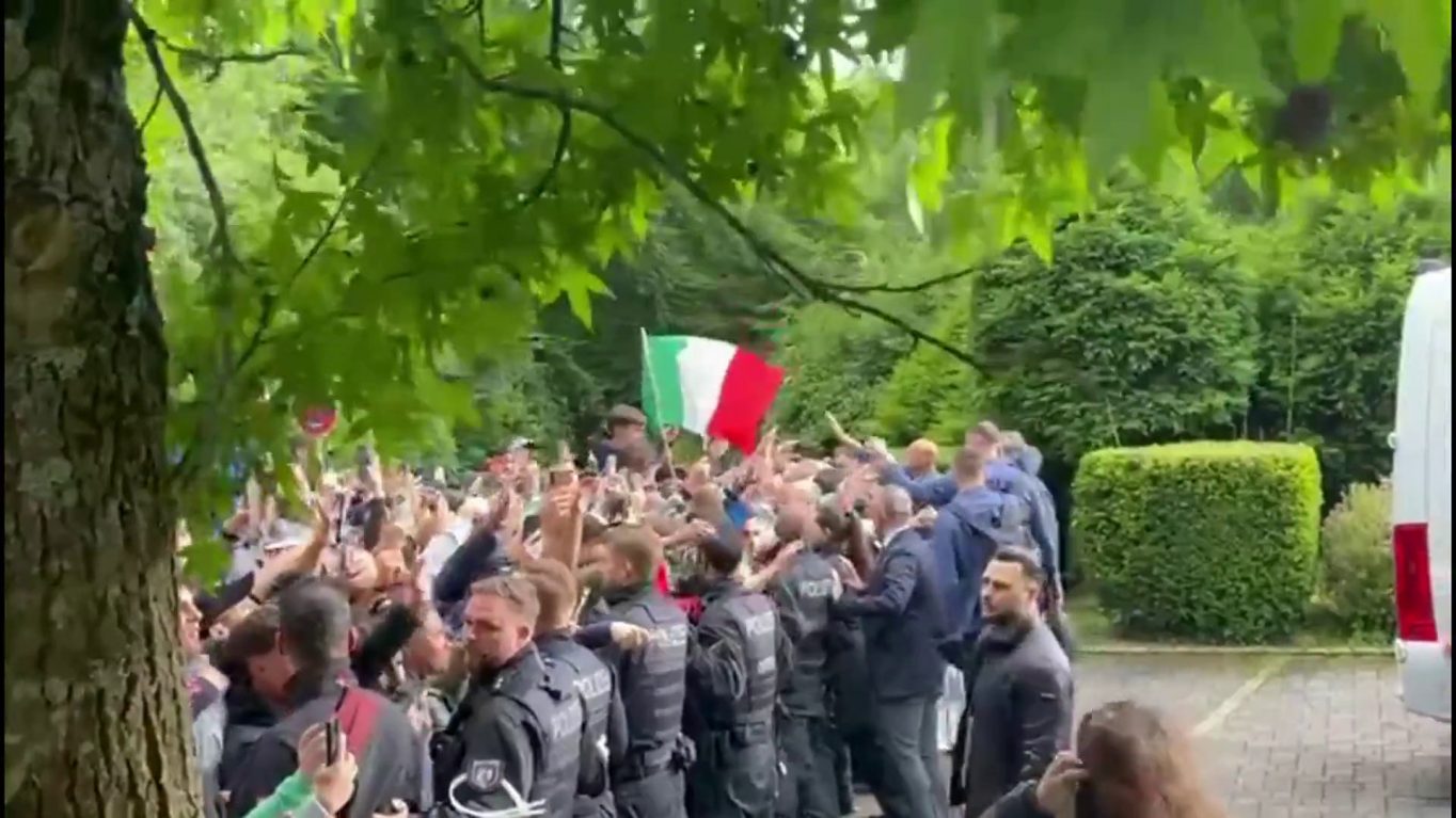 ISERLOHN (GERMANIA) (ITALPRESS) – Calorosa accoglienza per gli azzurri di Luciano Spalletti, atterrati a Dortmund prima del trasferimento per l’Hotel VierJahreszeiten di Iserlohn, con oltre un centinaio di tifosi ad attendere il pullman della Nazionale in vista dell’esordio agli Europei di Germania. ari/gm