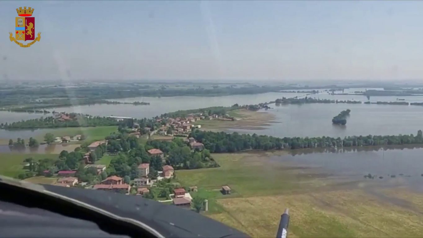 L’elicottero del Reparto volo della Polizia di Bologna sorvola le zone alluvionate in Emilia Romagna. tvi/gsl