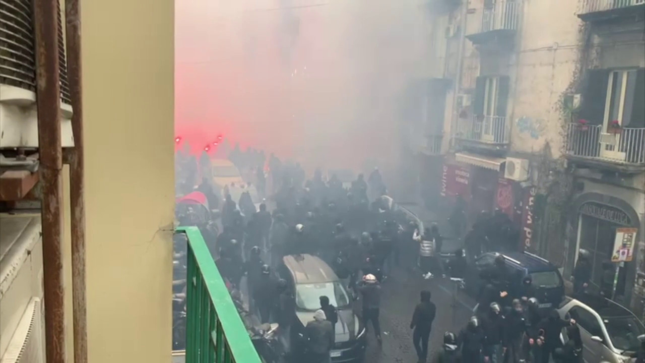 Scontri tra tifosi di Eintracht e Napoli in pieno centro nel capoluogo campano a poche ore dal via del match di Champions League. Nel corso degli scontri è stata data alle fiamme una macchina della polizia. sc/gm/gtr