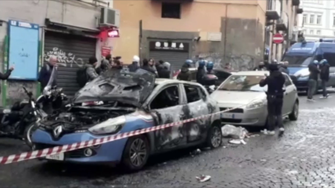 Macchina della polizia bruciata e cassonetti in fiamme. E’ il bilancio di quanto accaduto al centro di Napoli dopo la guerriglia con i tifosi dell’Eintracht. Lanci di sampietrini e oggetti da parte dei tifosi napoletani al passaggio dei bus con a bordo i tedeschi. xh6/pc/gtr