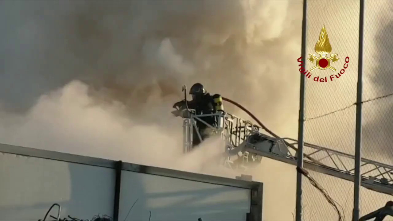 Vigili del fuoco al lavoro nella zona di Baggiovara, a Modena, per l’incendio di materiale plastico in un’azienda per riciclo rifiuti. Al momento le fiamme sono sotto controllo. Sul posto anche personale di Arpa Emilia Romagna per i rilievi ambientali del caso. tvi/gsl