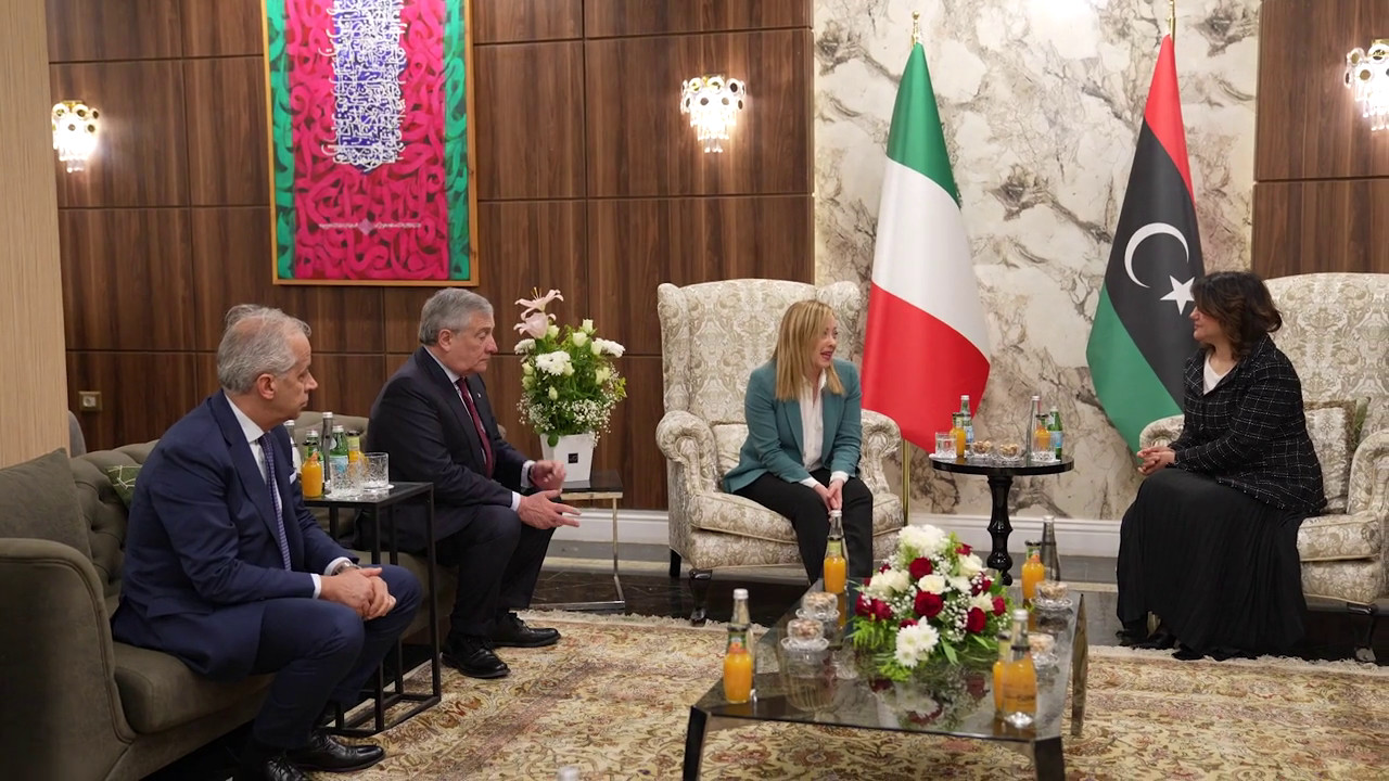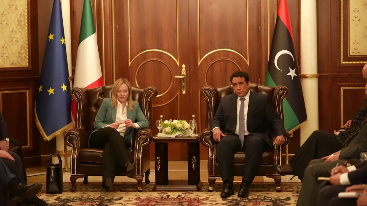 Il presidente del Consiglio Giorgia Meloni ha incontrato a Tripoli il Presidente del Consiglio Presidenziale dello Stato di Libia, Mohammed Yunis Ahmed Al-Menfi. mgg/ (Fonte video: Palazzo Chigi)