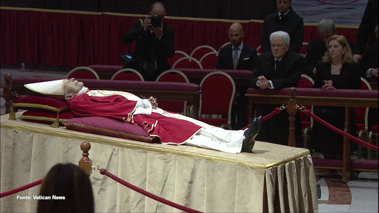 Il presidente della Repubblica, Sergio Mattarella, accompagnato dalla figlia Laura, ha reso omaggio alla camera ardente di Benedetto XVI, nella Basilica di San Pietro. sat/gsl (fonte video: Vatican News)