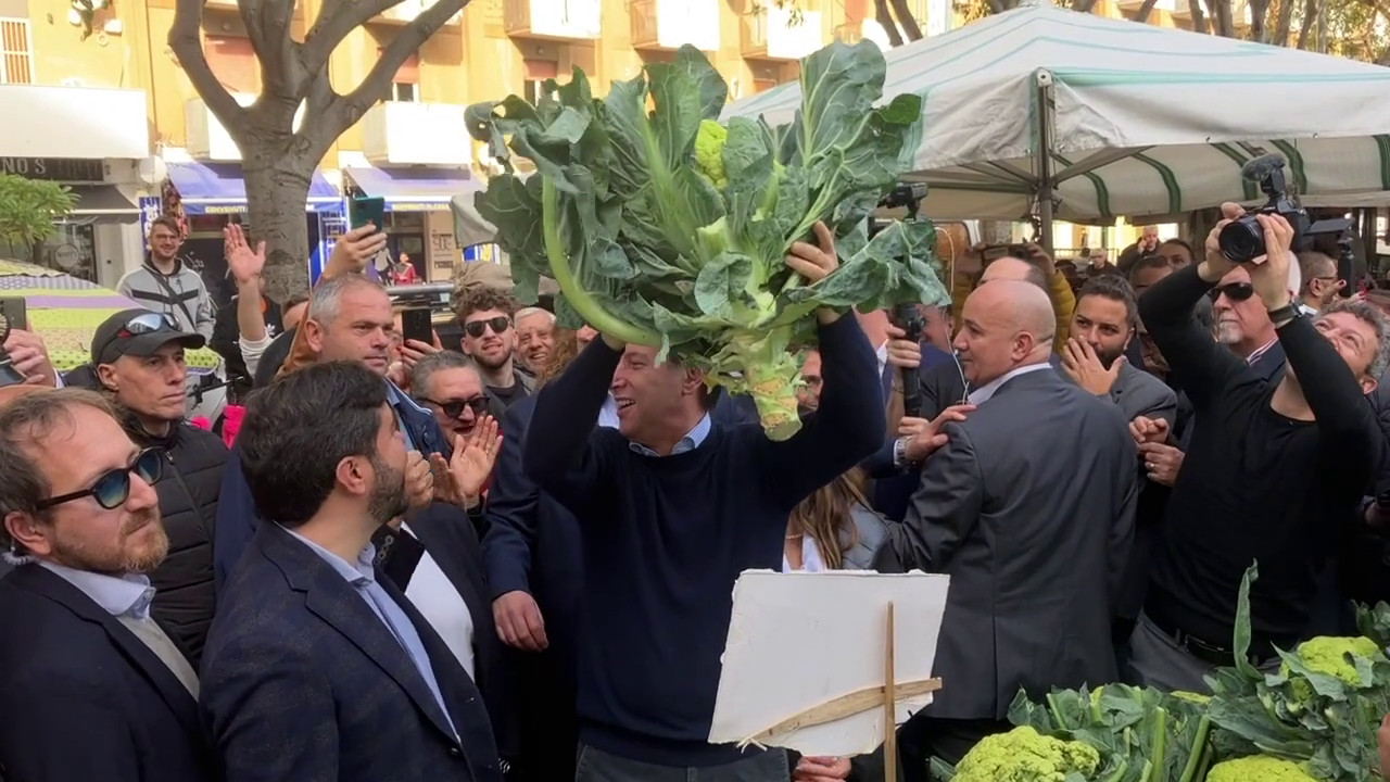In visita allo Zen di Palermo, il leader del Movimento 5 Stelle, Giuseppe Conte, scherza con i cittadini e i giornalisti: “Ecco la coppa del mondo dell’Italia”. E alza al cielo un grosso cavolfiore… xd6/abr/gtr