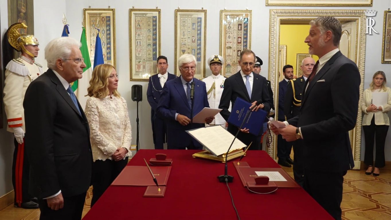 ROMA (ITALPRESS) – ROMA (ITALPRESS) – Il ministro della cultura, Alessandro Giuli, ha prestato giuramento, al Palazzo del Quirinale, nelle mani del Presidente della Repubblica, Sergio Mattarella. Erano presenti anche il presidente del Consiglio dei Ministri, Giorgia Meloni e il sottosegretario di Stato alla Presidenza del Consiglio, Alfredo Mantovano. col3/gsl (Fonte video: Quirinale)