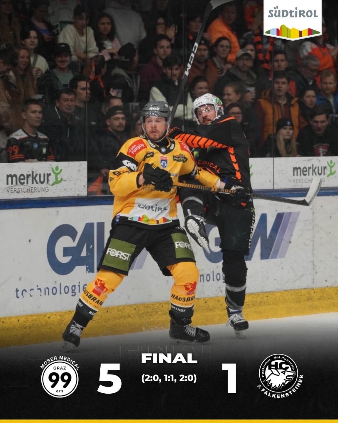 La prima sfida di finale della ICE Hockey League tra Graz e Val Pusteria, alla Merkur Eisstadion, se la aggiudica la formazione padrona di casa per 5 a 1.