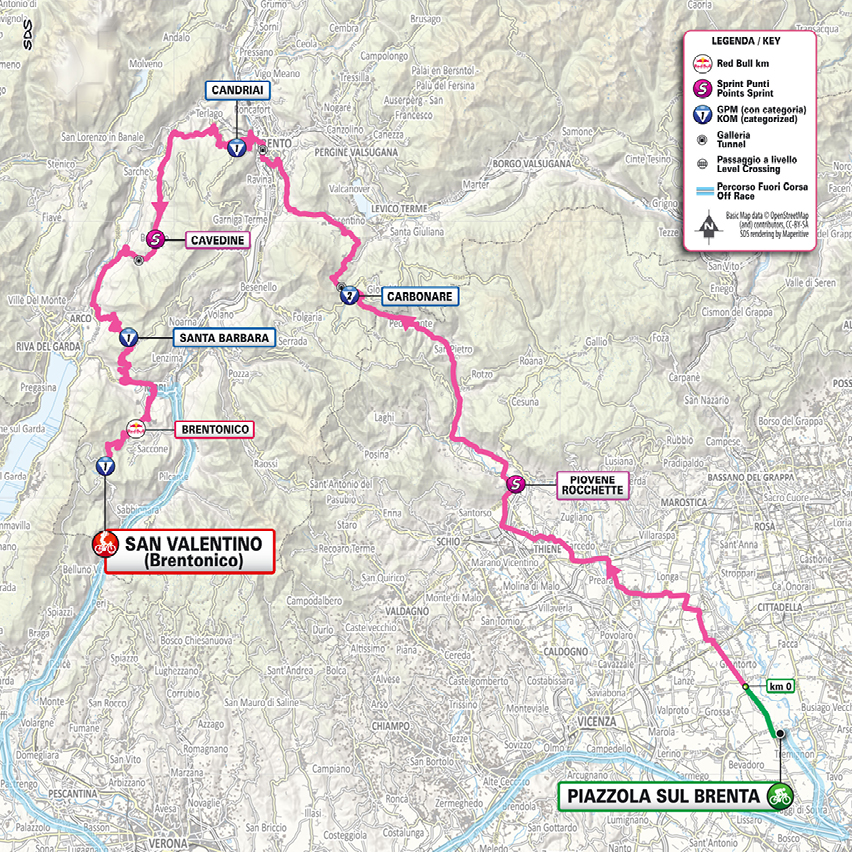 Il Giro d’Italia approda in Trentino. La prima tappa numero 16 è in programma martedì, con l’arrivo in salita a San Valentino di Brentonico dopo 199 chilometri con quasi 5mila metri di dislivello, e potrebbe rivelarsi decisiva per la classifica finale. Martedì i corridori partiranno da Piazzola sul Brenta, entreranno in Trentino dal valico della Fricca, per poi attraversare Trento (verso le ore 12) e affrontare il Monte Bondone. Dopo la discesa verso la Valle dei Laghi, la corsa toccherà Vezzano e poi l’Alto Garda, attraversando la Valle di Cavedine con anche la salita del Passo Santa Barbara.