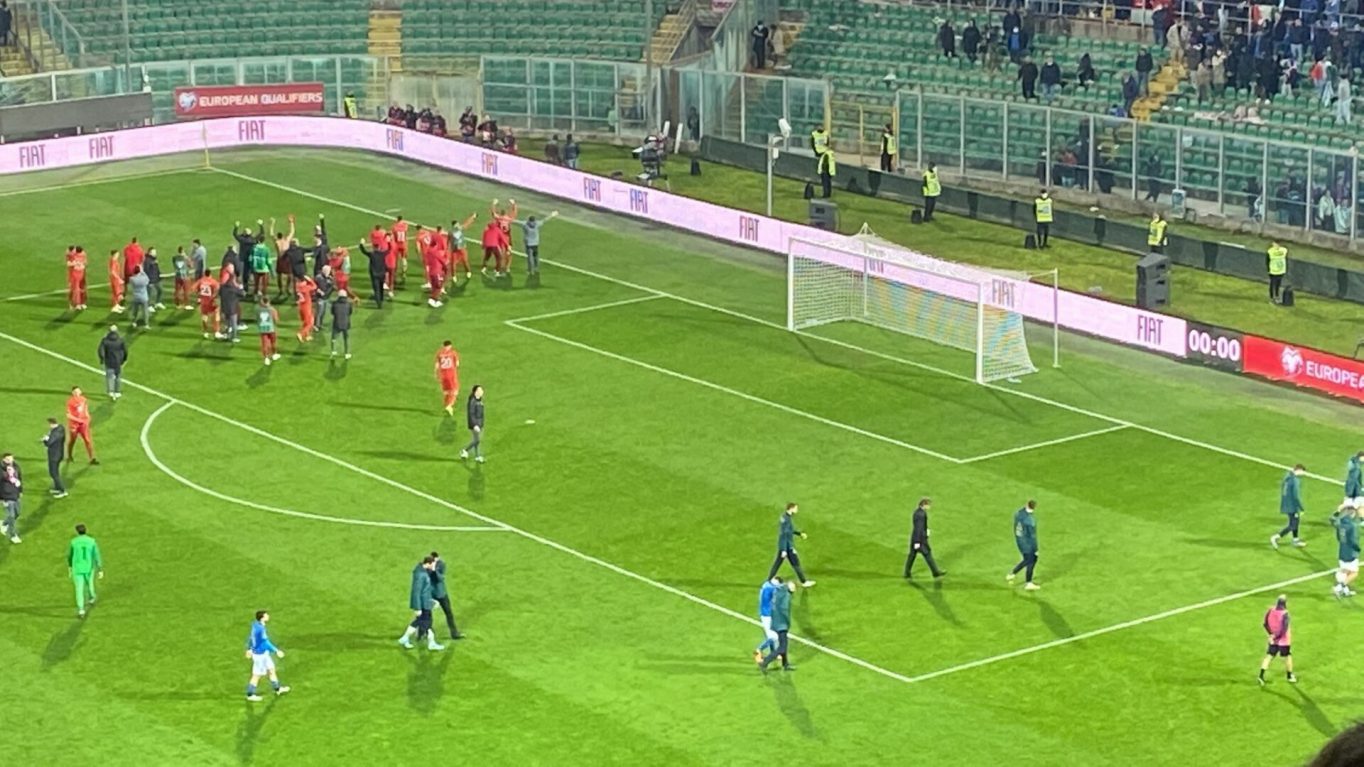 PALERMO (ITALPRESS) – La Nazionale di Mancini è eliminata dalla Macedonia e non parteciperà al Mondiale per la seconda volta consecutiva. Un gol dell’ex Palermo Trajkovski nel recupero condanna gli azzurri al Barbera dopo 90′ di assedio alla porta di Dimitrievski. La formula di Mancini a Palermo è quella di Wembley: impostazione a tre dietro, Insigne regista d’attacco e pressione alta. Ma la difesa è tutta nuova con Mancini e Bastoni al centro del reparto. La prima occasione da gol nasce dall’errore di un avversario. Pasticcio al 30′ del portiere Dimitrievski che consegna la palla a Berardi ma l’attaccante del Sassuolo grazia gli avversari con un tiro fin troppo debole e leggibile. Dalla mezz’ora in poi gli azzurri iniziano a costruire occasioni. Primi squilli di Immobile (30′) e Insigne (32′) ma in entrambe le circostanze, i loro tiri sono deviati in calcio d’angolo. Nel finale la Macedonia spaventa gli azzurri. Al 39′ Trajkovski si invola verso la porta dopo una sbavatura di Mancini, ma Florenzi è decisivo con un intervento pulito da ultimo uomo. Poco dopo Donnarumma è chiamato in causa da una conclusione potente ma centrale di Ristovski. Tra il 53′ e il 60′ prova ad accendersi Berardi: il primo tiro è alto, il secondo – da posizione favorevole – è deviato al momento decisivo da Alioski. Al 64′ Mancini toglie uno spento Insigne per giocarsi la carta Raspadori. Poi è il turno di Tonali e Pellegrini al posto di Barella e Immobile. Gli ultimi cambi (Chiellini e Joao Pedro) non scuotono gli azzurri dal torpore. Ci prova Pellegrini da posizione defilata, ma il suo tiro cross è impreciso. La voglia di creare si trasforma in frenesia. Serve di più in attacco e lo psicodramma è dietro l’angolo. Al 92′, in pieno recupero e alla prima occasione del secondo tempo, la Macedonia passa in vantaggio. Merito dell’ex Palermo, Trajkovski che si coordina dalla lunga distanza e beffa Donnarumma per l’1-0 che condanna gli azzurri alla seconda eliminazione consecutiva dal Mondiale.