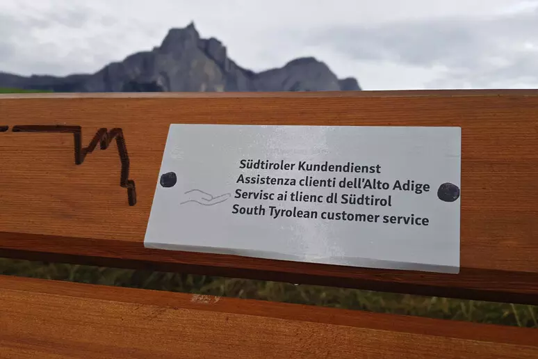 Questa volta si tratta invece di adesivi con la scritta “Assistenza clienti dell’Alto Adige” in quattro lingue, applicati in numerosi posti di forte richiamo turistico, come segnaletica, panelli informativi, panchine e punti panoramici.